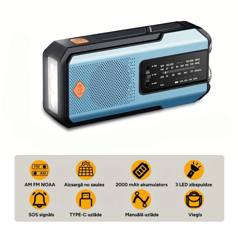 Saules un rokas krāna avārijas radio ar 3 x 0,2 W ultra-spilgtu LED zibspuldzi, saules enerģiju un 7400 mWh uzlādējamu bateriju – AM/FM/NOAA laika brīdinājumi, C tipa tālruņa lādētājs, manuāla enerģijas ģenerēšana, SOS signāls kempingam, pārgājieniem un ārkārtas situācijām.